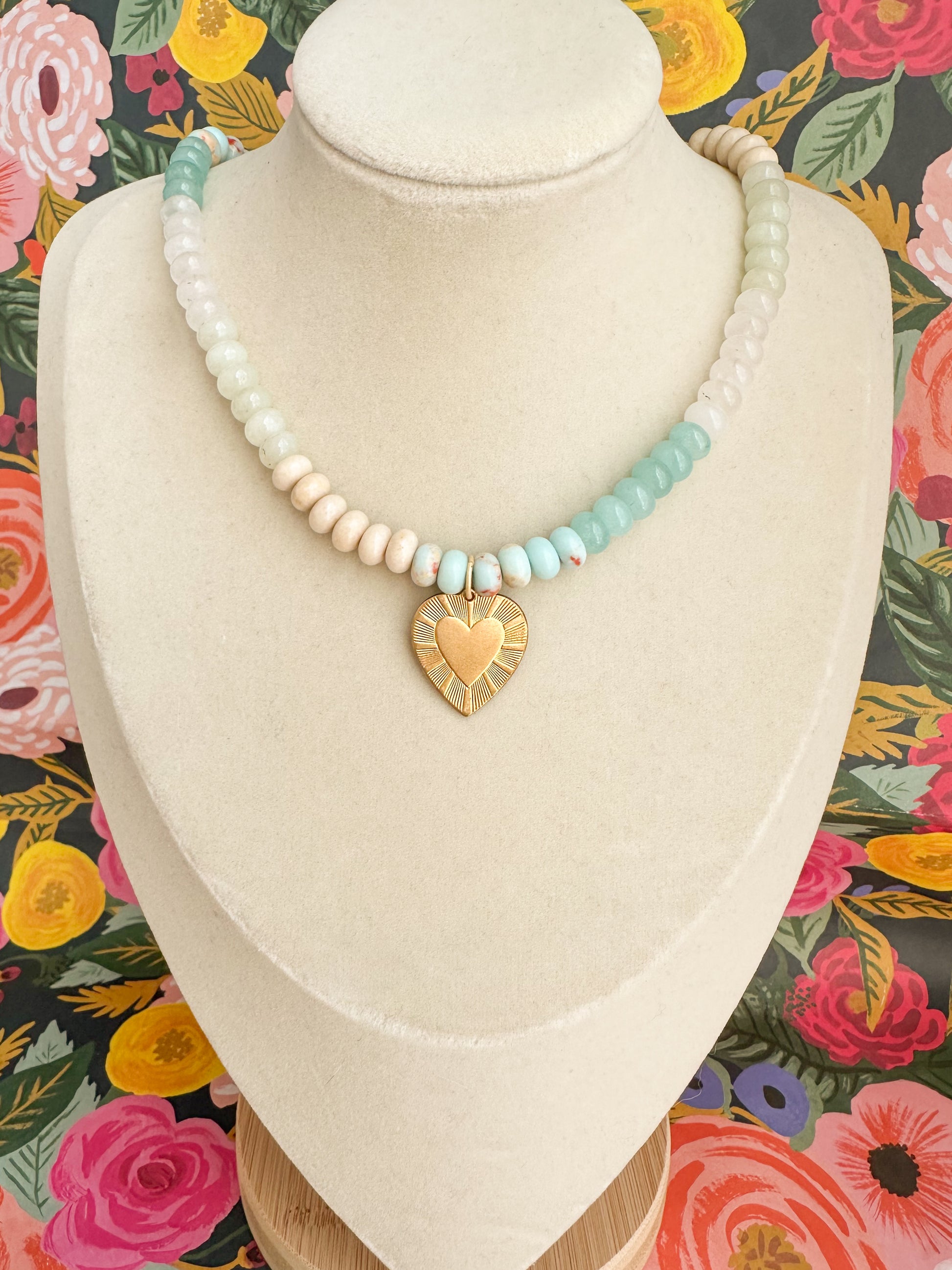 Aqua and Cream Jade Necklace with Vintage Heart Charm-Piper