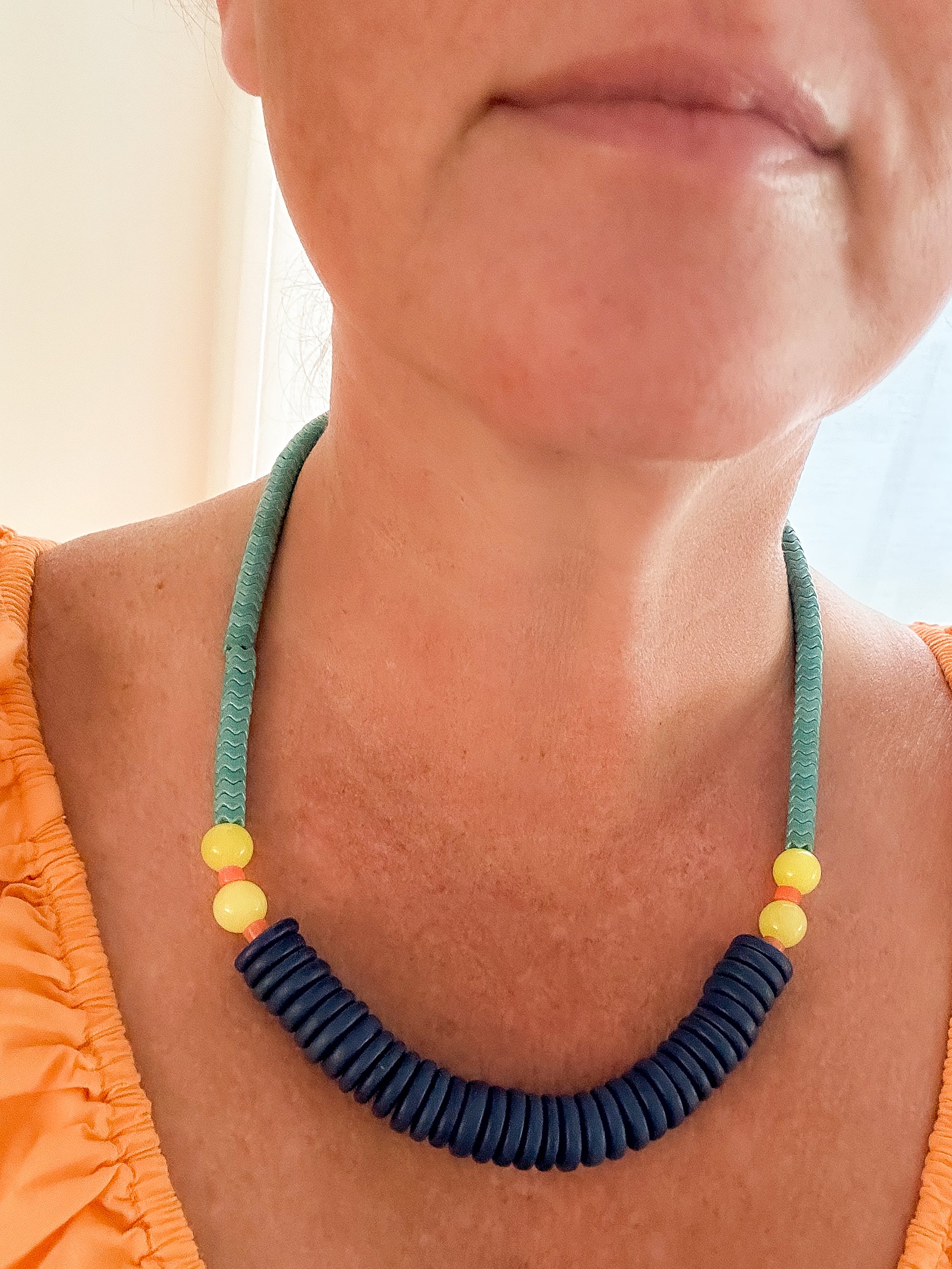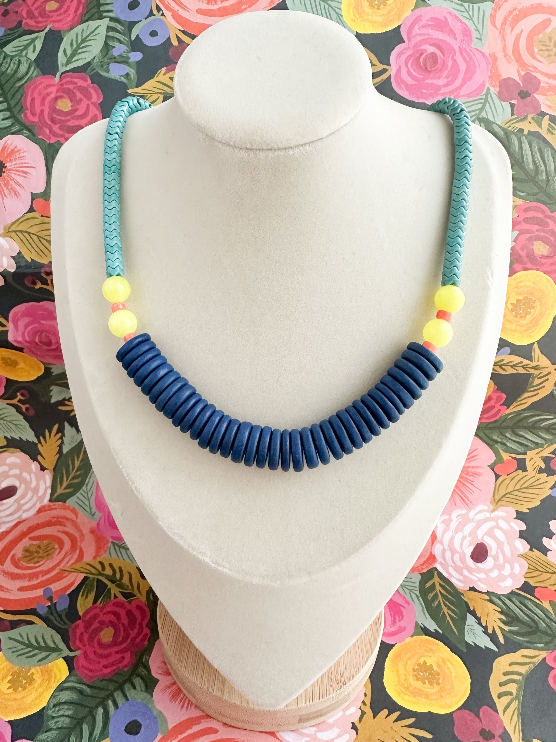 Turquoise Blue Howlite Snake Beads, Neon Lemon Jade, and Tawainese Dark Blue Wooden Beads.