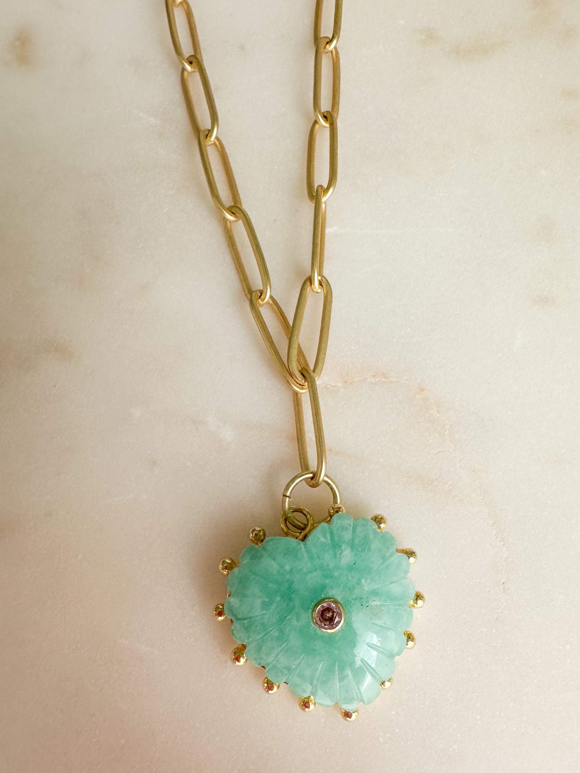 Carved Amazonite Heart Pendant on on 14K Gold Plated Paperclip Chain.