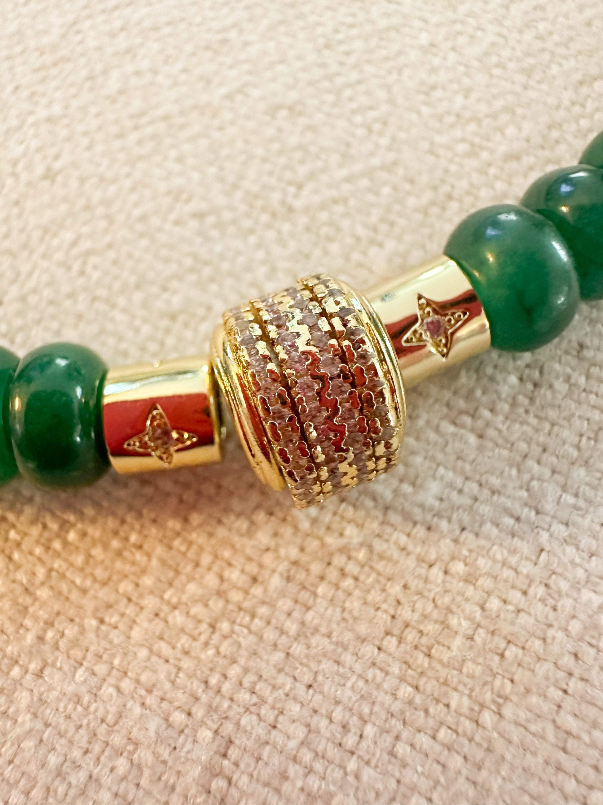 Green Jade Beads with Gold Plated Barrels with CZ.